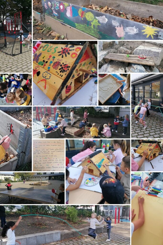In dieser Woche war wieder richtig was los! Mit viel Begeisterung wurden bunte Vogelhäuser bemalt, und auch die Holzumrandung des Beets verwandelte sich dank der kreativen Ideen der Kinder in einen echten Hingucker. Zwischendurch ging es sportlich zu – beim Tischtennis, Seilspringen, Limbo und natürlich beim Fußballspielen. Am Sandtisch wurden fleißig Buchstaben und Zahlen nachgespurt. Ein besonderes Highlight: Die Viertklässler gestalteten für die Erstklässler ein großes, farbenfrohes Regelplakat, das am Ende von allen Kindern mit ihrem Fingerabdruck unterschrieben wurde – ein richtig schönes Gemeinschaftswerk!