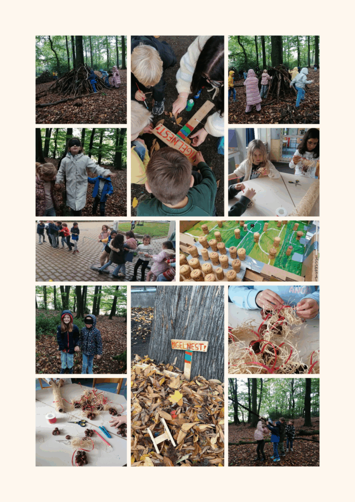 In dieser Woche war bei uns in der OGS wieder richtig was los! Am pädagogischen Tag haben wir gemeinsam einen Ausflug in den Wald gemacht. Dort haben die Kinder ein großes Tipi gebaut und erlebten beim Spielen und Ausprobieren, wie schön es ist, im Team etwas entstehen zu lassen. Außerdem gab es verschiedene Achtsamkeits- und Vertrauensspiele, bei denen Zusammenhalt und Rücksichtnahme im Mittelpunkt standen. Zurück in der OGS wurde mit viel Kreativität ein eigenes Fußballfeld gebastelt, und im Freispiel entstand spontan ein Tauziehspiel, bei dem alle mit Begeisterung dabei waren. Auch mit unseren Kastanien wurde weitergearbeitet: Die Kinder haben sie liebevoll mit Bast und Geschenkband verziert – so entstanden kleine Kunstwerke. Im Schulgarten haben wir außerdem gemeinsam ein gemütliches Igelnest gebaut, damit unsere stacheligen Freunde im Winter einen warmen Unterschlupf finden. Eine Woche voller Teamgeist, Bewegung, Kreativität und Naturerlebnisse!