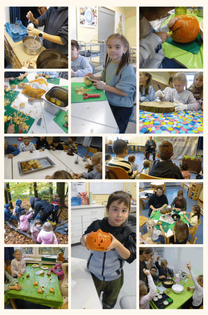 In der zweiten Herbstferienwoche drehte sich alles rund um die Kartoffel. Wir starteten mit spannenden Experimenten und erforschten, was die „tolle Knolle“ alles kann. Außerdem hatten wir besonderen Besuch: In einer Mitmach-Vorstellung erfuhren die Kinder auf unterhaltsame Weise noch mehr über die Kartoffel und ihre Bedeutung. Ein weiteres Highlight war unser Ausflug in den Wald. Die Kinder bauten dort einen eigenen kleinen Unterstand und genossen anschließend ein gemütliches Picknick in der Natur. Zurück in der OGS wurden sie mit heißem Kakao und selbstgemachten Apfelmuffins empfangen. Auch die Kreativität kam nicht zu kurz: Die Kinder schnitzten Kürbisse und gestalteten auf Baumscheiben kleine Spiele mithilfe eines Brennpeters. Am Ende der Woche gab es einen schönen gemeinsamen Abschluss: Die Kinder schälten Kartoffeln für eine selbstgekochte Kartoffelsuppe, die wir in gemütlicher Runde zusammen mit den Eltern genießen konnten. So erlebten die Kinder eine abwechslungsreiche Herbstwoche – mit Lernen, Spielen, Erforschen und ganz viel Spaß.