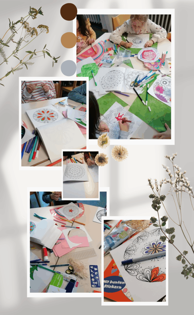 Zu Beginn der Woche haben wir uns in der OGS mit dem Thema Mandalas beschäftigt. Der Gruppenraum wurde dafür bewusst ruhig und gemütlich gestaltet: leise Entspannungsmusik lief im Hintergrund und Lichterketten sorgten für eine warme, angenehme Atmosphäre. Auf den Tischen lagen verschiedene Mandala-Vorlagen sowie bunte Stifte bereit. Viele Kinder tauchten dabei richtig in ihre Arbeit ein – sie waren konzentriert, ruhig und wirkten sehr ausgeglichen.