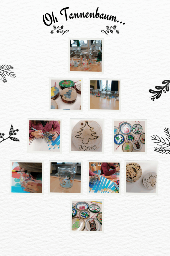 Diese Woche dürfen wir den Tannenbaum in der OGS schmücken – und dafür haben die Kinder ihren eigenen Weihnachtsschmuck gebastelt. Aus Schraubglasdeckeln, Gläsern und Mini-Baumscheiben entstanden kleine, kreative Kunstwerke. Die Kinder konnten die Deckel, Gläser und Holzscheiben frei gestalten und weihnachtliche Motive darauf malen – von Sternen und Tannenbäumen bis hin zu Schneemännern und Rentieren. Mit viel Fantasie und Freude sind so einzigartige Anhänger entstanden, die unseren Tannenbaum in diesem Jahr besonders persönlich und bunt machen.