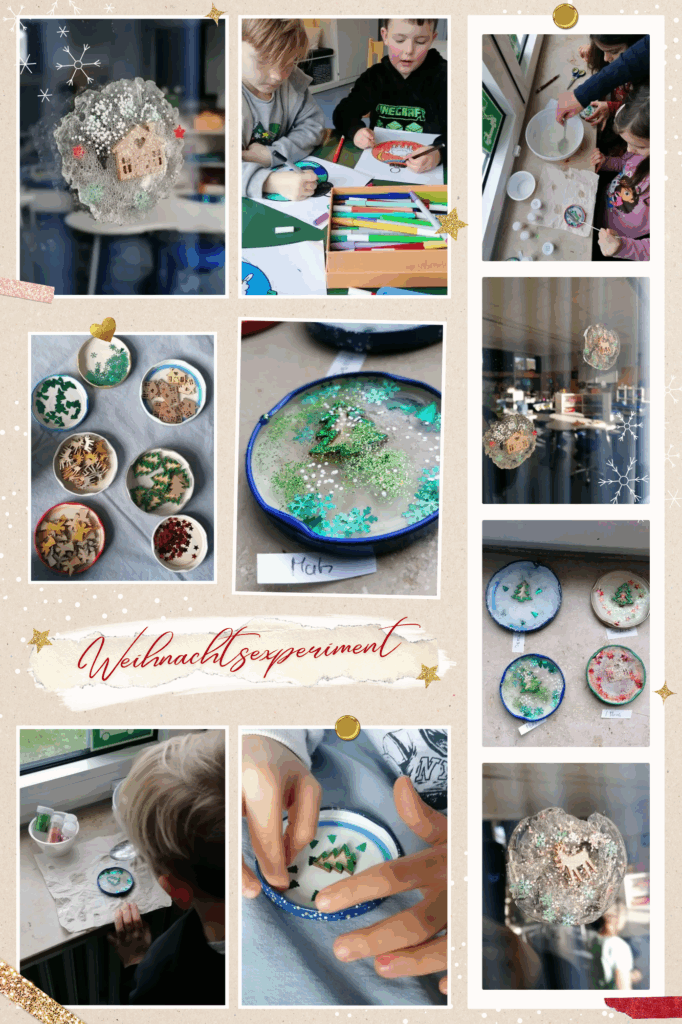 In der OGS haben wir ein kleines weihnachtliches Kreativ-Experiment gestartet: Aus Gelatine und Schraubdeckeln entstanden wunderschöne, transparente Fensterbilder. Zunächst haben wir die Gelatine leicht erhitzt und gut durchgerührt. Währenddessen suchten sich die Kinder kleine weihnachtliche Mini-Motive aus und legten diese in die Schraubdeckel. Anschließend wurde die flüssige Gelatine vorsichtig darüber gegossen. Nachdem alles vollständig abgekühlt und fest geworden war, konnten die Kinder ihre Bilder vorsichtig aus den Schraubdeckeln lösen und an die Fenster kleben. Für uns alle war es ein spannendes kleines Experiment, da wir diese Technik zum ersten Mal ausprobiert haben – mit tollen Ergebnissen und viel Freude bei den Kindern.