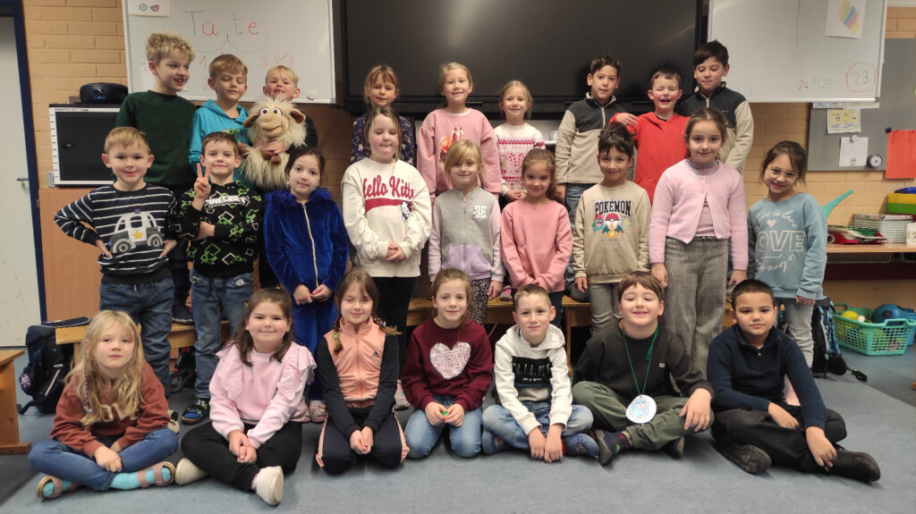 Wir sind die Klasse 1b und unsere Lehrerin ist Frau Brück. Zusammen mit unserem Schäfchen Lilo haben wir viel Spaß!.